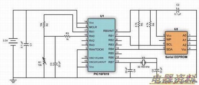 如图1所示,设计人员可利用微控制器的I/O接脚和一些程序代码,在需要时对EEPROM和传感器供电。由于所选微控制器的I/O接脚最高可以提供20mA的电流,所以不需额外电源。