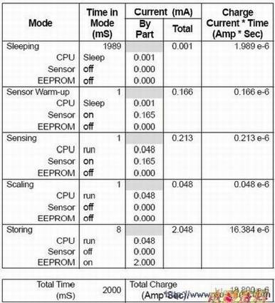 根据表1可知,数据记录器的应用,在每个周期约为2000ms,需要的总电荷量为18.8 e-6安培*秒。根据表1的数据,可以推算出平均电流为0.009mA,如下: