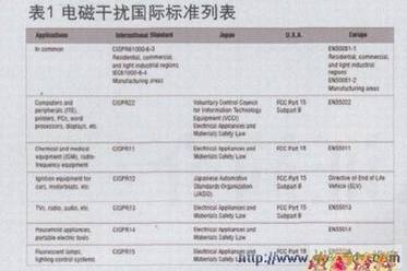 直到目前为止,确定一个产品会不会影响另一个产品功能的技术仍不是一门精确的科学,且由于产品组合太过复杂,认证机构不可能针对每一种产品组合都进行检测,因而相关主管机关莫不采取从严把关的态度。图1是国际无线电干扰特别委员会(CISPR)针对每个国家所发射的电磁干扰所制定的标准。CISPR 是国际电工委员会(IEC)的特别委员会。