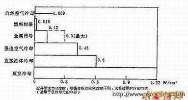 大部分热设计适用于上面这个图表,因为基本上散热都是通过面散热。但对于密封设备,则应该用体积功率密度来估算,热功率密度=热量 / 体积。下图(图2)是温升要求不超过40℃时,不同体积功率密度所对应的散热方式。比如某调整芯片,热耗为0.01W,体积为0.125cm3,体积功率密度=0.1/0.125=0.08W/cm3,查下图得出金属传导冷却可满足要求。