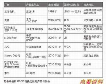 2D-3D转换技术从上世纪90年代后半期开始商用。三洋电机等开发出了专用LSI,并于2002年配备在手机上。将过去很受欢迎的2D电影转换为3D电影时也采用了这种技术。不过,直到几年前,自动转换技术还不成熟,让人眼感到不适的情况不在少数。因此,不少厂商对2D-3D转换技术的使用持怀疑态度,“如果推出制作不精良的3D影像,反而会降低人们对3D影像的评价”。不过,已投放市场的3D电视中有很多机型都具备2D-3D转换功能。