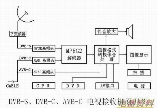 下面是能接收各种电视信号(卫星、有线数字、有线模拟)和普通电视信号的电视机主要部分方框图。广播电视信号和卫星电视信号及有线电视信号的区别只是高频传输和方式不同,对于电视机来说,就是高频头工作方式不一样。高频信号首先被送入电视机的高频器,经或变频,输出TS流(数字信号)或中频信号(模拟信号),再由后面的MPEG2或进行中频放大、图像解调,将图像信号与音频信号从数字信号或载波中提取出来。图像信号经过处理后,再经视频放大放大,最后送给电视机显像管进行图像显示;音频信号在经过伴音通道处理后通过还原为原来的声音。