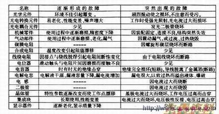 (2)仪器设备质量缺陷引起的故障(必然故障)。1)元器件质量不好造成的故障:这类故障因元器件本身质量不好所造成,同一类元件发生故障具有一定的规律。常用元器件的常见故障如附表所示。2)设计不合理造成的故障:这方面的故障有时会导致有关元器件频繁损坏。有时则可能使仪器性能下降而无法正常工作。这类故障多见于新产品。3)装配工艺上因疏忽造成的故障:这类故障多在装配过程中因虚焊、接插件接触不良以及各种原因引起的碰线、短路、断线、零件松脱产生的。