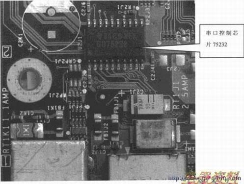 COM口一般是直接和串口控制芯片(75232或75 1 85)相连,串口控制芯片再与I/O芯片相连,数据经过I/O芯片处理后进入南桥芯片。下图所示为串口控制芯片75232。