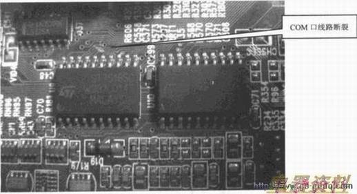COM口是直接与串口控制芯片连接的维修中如果测出引脚对地阻值为无穷大,则应仔细检查铜箔线路是否已断裂,如下图所示。