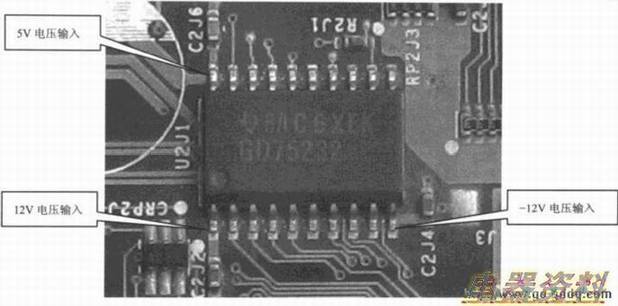 在线路完好的情况下,可以检查串口控制芯片的5V、12V、-12V供电是否正常,如下图所示。如果电压不正常,则应检查与之相连的供电线路。