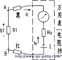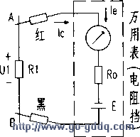 2.测得的电阻值大于实际电阻值将上述测量中的红、黑表笔对掉,即用万用表黑表笔接A点,红表笔接B点时(见左图),Ul与E反串,Ul提供给表头的电流Ic的方向和表内电池E提供的电流Ie的方向相反。使得通过表头的电流减小,测得R1的阻值偏大。当U1的大小接近E时。指针几乎不偏转。Rl会被怀疑断路。如Ul》E.将会使表头中通过的电流远大于其满偏电流,轻则将万用表的指针打坏。重则烧坏表头,有时还会通过万用表将高电压加到某元件上而将之损坏。由此可见。检测时对高压电容放电的重要性。