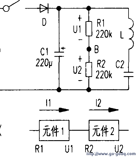 上图为某等效电路的。一部分,检测电路时应先将Cl进行放电处理。因Cl工作时充了电,其端电压可高达300V,而且放电时间常数很大,τ≈(Rl+R2)Cl≈175s,电容放电完毕需经过(3~5)τ,约lO分钟左右,放电十分缓慢,放电时在R1、R2上分别产生电压降Ul、U2。