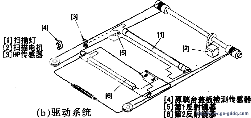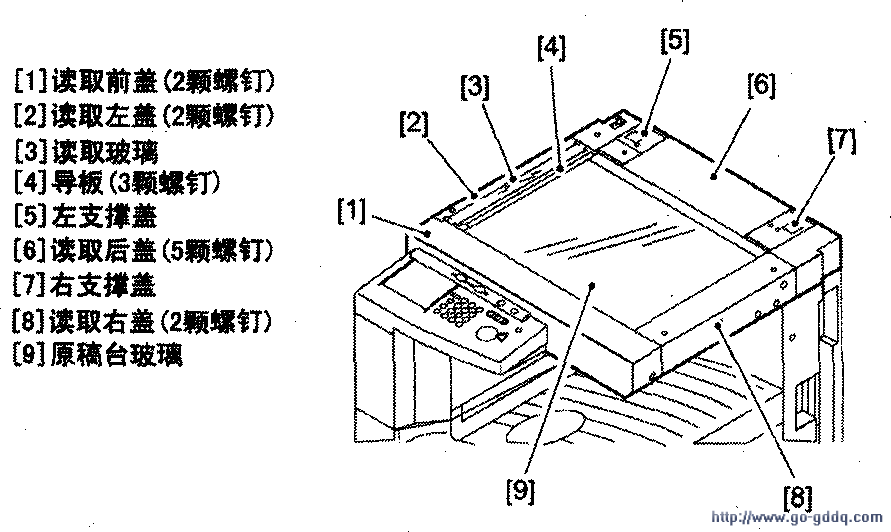 7.拆卸与安装前必须拔下机器的插头,严禁带电操作;不在缺少零件的情况下通电试机;若无特别说明,安装是拆卸的逆顺序;各处螺钉长短有别,最好做记号;拆卸曝光灯应待其自然冷却后进行,避免烫手,安装曝光灯时不能在灯管表面留下指纹。