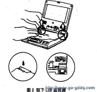 2.取下监视器参见图2,LCD监视器两侧(图中用黑圈画出的部分)向箭头所示方向拆开,注意不要损坏或拆断接线部分,也不可丢失开关探测件。