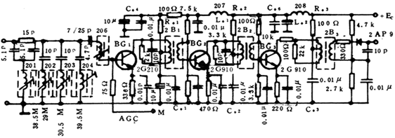 | 下图是为4D4型电视机的中放,其中201、202、203、204是吸收回路,分别对相邻高低频道的图像及伴音的干扰进行吸收,其吸收频率分别为38.5兆赫、29兆赫、30.5兆赫、39.5兆赫。本电路采用三级单回路调路放大器组成,第一至第三级的谐振频率分别是:34.5兆赫、33兆赫、36兆赫,故属于三级参差调谐放大器电路,该电路采用失配法来实现防止自激的,故每级调谐回路并联一个阻尼(2千欧、3.3千欧、22千欧),为了避免级间经内阻产生的交流耦合,采用了多个电路:Cφ1Rφ1-Cφ4Rφ4以及Cφ5Lφ1、Cφ6Rφ20 |