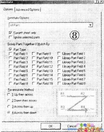 如果电路比较复杂,用上述人工编辑元件序号时可能会出现重复、漏编、错编等情况,自动布线时会出错,因此,执行Protel的自动重编元件序号功能,可以避免差错。在“两级放大电路.Sch”设计窗口下,单击菜单Tools/Annotate...,将出现Annotate对话框如图8所示,在Options选项下,单击AnnotateOptions栏的下拉箭头,在下拉列表中选取AllParts.然后单击下方“ok”按钮,将自动生成“单管放大电路.ERP”文件,同时在打开的“单管放大电路.ERP”文件窗口中可见:重编序号后,R1的序号重编为R9;R5的序号重编为R10,Cl的序号重编为C6……等等。