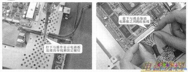 在拆卸这些螺钉之前,先要将主控电路板与液晶板组件等之间的连接线拆下,如下图所示。