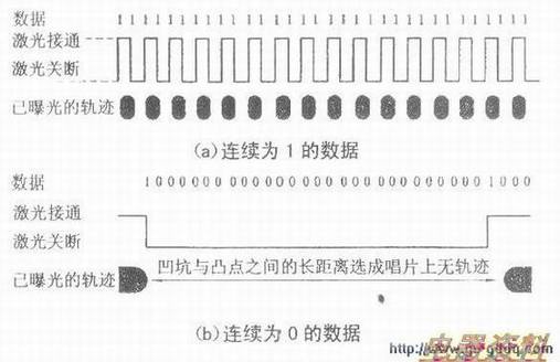 用激光束向光盘写入数据时,激光束的通、断可在盘面上形成交替出现的凹面和凸面,它对应了一定规律性的数码。它规定:在激光束接通或断开的瞬时,对应数码1;而数字0不直接记录在光盘上,但可由重放再生出来。数据流是由一系列数码0和1组合而成,都是相互或基本上相互交替出现的。但是,也有时会出现数码连续为0或连续为1的情况,而这两种极端情况将带来一些不良影响,下图所示为两种极端情况。先看数码连续为1的情况,此时激光束的通断最高。光盘凹坑的长度很短,甚至比凹坑的宽度还要短,致使激光束较长时间照射不到坑。频繁的数码1经过积分电路后,会形成变化的直流,可能引起伺服误差信号的降低,使伺服系统工作不稳定。再看数码连续为0的情况。此时凹坑过长,在较长时间内没有出现数码1,会使数字处理电路的压控(vco)工作不稳定,还会使伺服跟踪循迹性能变坏。采用有效的调制处理后,可较好地克服以上矛盾。总之,为了使影碟机伺服系统稳定地工作,应当尽量减少信号的低频分量和直流平均分量,努力减少干扰。在刻录光盘之前,进行EFM、EFM+等调制处理,可以顺利达到上述要求。
