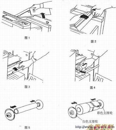 (5)取下左右支撑轮见图5,从旧蜡纸卷下取下左、右支撑轮。