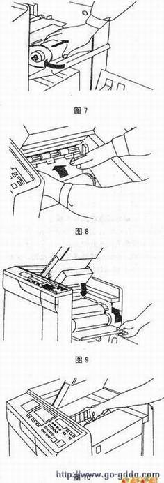 (IO)合上蜡纸装载单元和原稿台见图10,轻轻地合上蜡纸装载单元,并将原稿台复位。如果说蜡纸头放到绿胶片下太多,多余部分将被自动剪切掉,剪切的蜡纸条还在里面时,面板上的CHECKSETTINGC指示灯闪亮,提示请拿走蜡纸条。