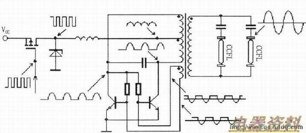 如果在保护电路未工作时测得无放电火花产生,则应测量各级供电是否正常,背光灯启动信号是否正确,用示波器测量末级驱动管或者控制集成块信号输出引脚看是否有50以上波形(具体因机型而异,通常幅值在10~20V(峰峰值))。如果有波形,故障一般在高压、次级高压输出或灯管。Royer结构逆变电路各点波形见下图所示。