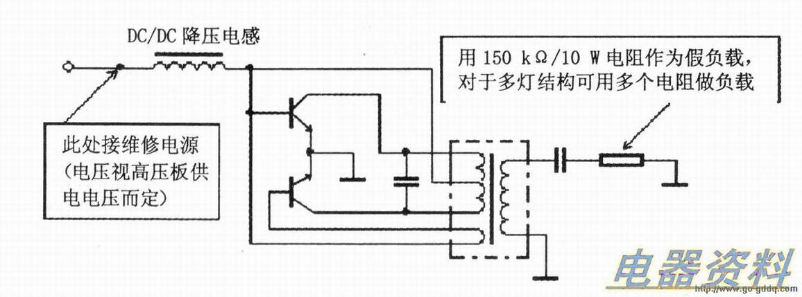 如果确认故障在逆变电路上,不连接灯管检修会因为保护电路启动而影响判断,连接灯管检修又因为灯管脆弱、长度太长而比较麻烦,此时就可以应用“假负载法”进行检修。其方法如下图所示。即在背光灯电源电路的高压输出端用一个150kΩ/10W的水泥来代替灯管。