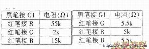 实际测量NEC14英寸彩色显像管的数据如下:用MF47型指针式Rxk挡,黑笔接Gl,红笔分别接R、G、B各极,用直流稳压给灯丝加6.3V电压,显示为0.3A,预热后测得数据见下左表。该实际使用的显示器,故障表现为图像颜色严重偏色,几乎没有红色,光栅亮度不够。可以显示电视盒输出的电视信号,但几乎没有彩色。根据以上数据,判显像管严重衰老。