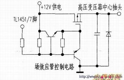 (2)高压变压器的检测:变压器共有4个绕组。2个初级:1个高压.1个回馈(见上图)。变压器的焊点经常虚焊,补焊就OK了。一般不用怀疑高压变压器,因为它的输出相对很低(700V),圈数也少,内部没有整流、倍压等元件,不容易出现彩电次级短路的故障。若要判断变压器好坏,可利用彩电的高压包,在其磁体上外加一个绕组(5_lOI),将这个绕组的线接到拆出的高压变压器的任一个初级绕组上,另一个初级绕组接一个6V灯泡,在彩电高压包正常工作的情况下,如果灯泡亮,说明被测的变压器正常。如果被测变压器内部短路,彩电行电流增大,甚至保护或出现光栅异常的现象。