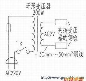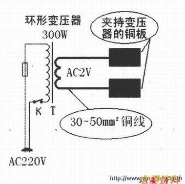 硅钢片类变压器、、驱动器等属于合金类材料,具有较低的电阻值,拆卸时可利用低电阻值大电流流过时,产生的热效应快速加热,效果非常好,如中图所示。选择300W的环形电源变压器不用改动其他绕组,直接在线圈外面用φ30mm2~50mm2的绝缘铜线绕制,也可用较细的多股铜线绕剖,只要面积达到即可。绕制完毕后直接引出外留φ30公分—50公分做引线端,在端部去掉绝缘器之后套上绝缘软套管变压器部分固定,端部直接做好上锡,冷轧在两块长5公分.宽两公分的薄铜板上。铜板厚度一般不要太厚,一毫米以下,一方面重量轻、方便,另有一定电阻也可防止电流过大,铜板不需取面积很大,对于大个头变压器如果铜板面积过大,体电阻过小会降低效率引起铜线发热。