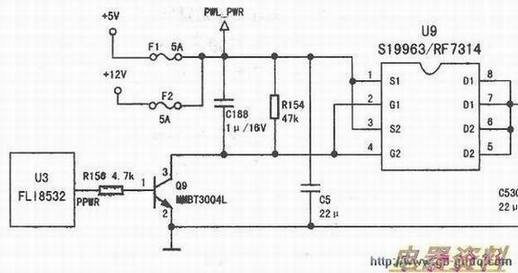 主板工作后,主芯片U3(FLI8532)输出屏供电高电位控制信号至Q9的b极.Q9导通,屏供电经U9加至屏上.Fl、F2为屏供电选择,局部电路见下图。