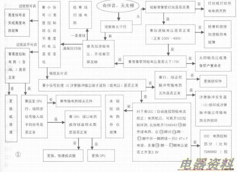 1.有伴音、无字符、无光栅故障的检修思路及步骤