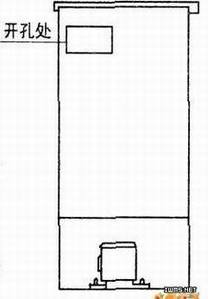 确认蒸发器泄漏后,如是先从冷藏制冷的冰箱,泄漏多在铜铝接头处。为找准铜铝接头准确位置,可将制冷系统简单抽空后加制冷剂,启动压机制冷,观察制冷剂进入冷藏室的位置(是先左还是先右),看好后作上记号,量好尺寸。然后从冰箱背面用直尺量出铜铝接头的中心位置,以该中心为基准向上50mm画一条长为50mm~180mm的直线,向下50mm也画一条与上线平行、长度相同的直线(铜铝接头在左,则在离左侧边沿100mm处,在右反之)。