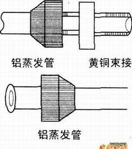 冷冻蒸发器的维修一般有三种情况:一是冷冻蒸发器的出口端有一根φ6mm的铜管直接插入冷冻蒸发器的φ8mm的铝管中,再将预先套在铝管上的罗克环用专用钳紧固,多数不会泄漏。因罗克环专用钳为进口产品,价格昂贵,所以用黄铜束接来修复。方法是:将中6mm铜管上套接一做好的喇叭口,并套上束接原配螺帽φ8mm铜管。因束接两端是相等的,所以多一道这样的工序(当然黄铜束接也有与φ6mm管子配套的,视维修需要而选用),两端均做好喇叭口后连接。第二种情况是蒸发器U形管处泄漏,可将蒸发管从固定板上拆下,切除漏点(尽量多裁掉一点,因束接本体还有一定长度),将U形管改为有利于与束接作同心性连接的状态,做好喇叭口进行连接,再嵌入固定板中。还有一种情况是有些牌子的冰箱将制冷分配器采用吹胀式两条通路放在冷藏室底部以L形固定,而制冷顺序又从冻室上部开始至中层,再至下层,最后到冷藏室,此种结构的冰箱一旦吹胀式管路发生漏点,可用AB胶粘补,当然也可以将吹胀式管路短接,短接部分用一根φ8mm铜管,两端均制成喇叭口,用两只束接将铜管两端与铝管作同心性连接。也可得到修复,总之凡是铝管路制成的蒸发器。一旦发生漏点,均可采用黄铜束接做成喇叭口连接的方式将其修复,即使是冷藏蒸发器拐点处也可采用同样的方法,只是破面要稍大一点。