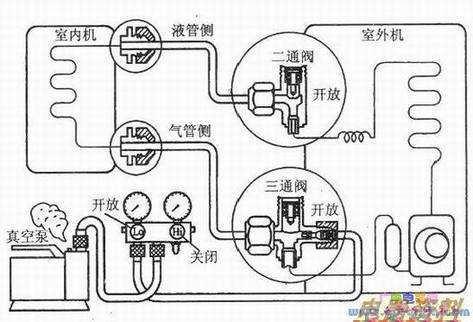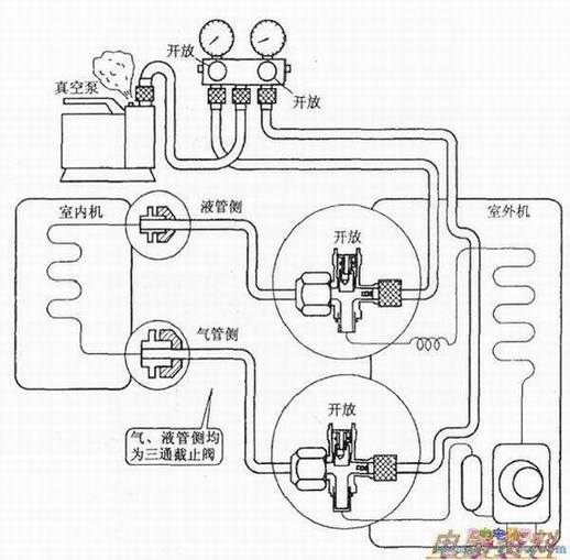 对于液管侧为二通截止阀的空调器,抽真空的方法如是图所示。对于液管侧为三通截止阀的空调器,抽真空的管路连接方法如下图所示。若在液管侧与气管侧同时抽真空,效果更好。