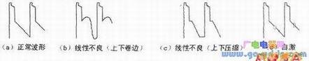 在检测场输出端波形时可能会出现如下图所示的几种波形。其中下图(a)所示是正常的场扫描锯齿波波形,周期20ms,场逆程脉冲宽度1.2ms,且正程下斜线的线性应良好。下图(b)所示波形说明场正程线性差,图像将出现垂直方向的、甚至卷边现象、或在图像顶部(或底部)出现白带甚至局部倒影。这说明场振荡或场锯齿波形成电路有元件不良。下图(c)所示波形说明场正程线性不良,图像上部或下部将出现压缩现象。其主要原因是场锯齿波形成电容不良或容量下降,或场反馈电路中有元件不良所致。下图(d)所示波形说明场输出级有高频自激现象,表现为光栅出现水平窄白带(或白线),故障通常是场输出级消振电容开路或容量变小所致。
