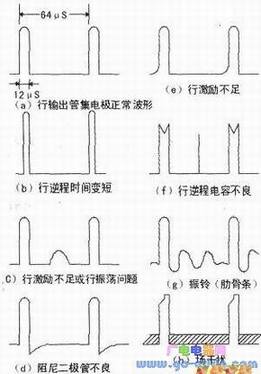 这通常是行阻尼管正向过大,或接触不良。此时荧屏左侧光栅中会出现2~3条竖直细黑线(阻尼条)或出现白色卷边。下图(e)所示波形的脉冲前沿出现斜坡,可能是行输出管B值下降或饱和压降过大所致。此时屏幕右侧光栅会出现白色卷边。下图(f)所示波形在正程期出现很窄的脉冲,而在逆程脉冲顶部又出现下凹现象,这通常是行逆程电容不良或开路所致。此时光栅水平尺寸变小,亮度增大,且有白色竖直条纹或线状纹干扰。下图(g)所示波形在扫描正程出现衰减式振荡波形。这是质量低劣、漏感严重产生的严重辐射所致。此时荧屏左侧(或全屏)会出现若干条肋骨状黑白相间竖条(亮度较暗时更明显)。下图(h)所示波形说明场频锯齿波信号窜入了行电路,形成场行信号,结果会导致光栅左右抖动。