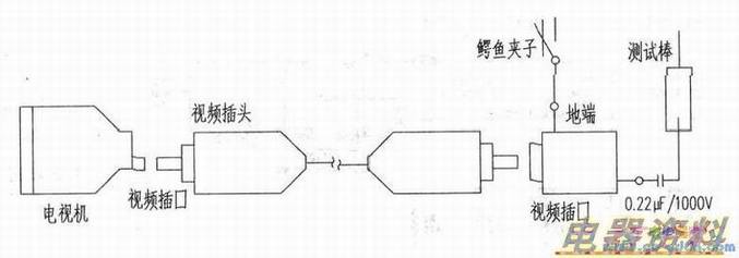 实现的办法就是做一个如下图所示的附件。取一段能插到电视机视频插口两端带有同样视频插头的导线一根,另外再拿一个视频插口,其接地的一端上一根带有鳄鱼夹子的导线,另一端(通信号的那一端)焊接上一只0.2211/1000V的器C,此器的另一端焊上带有测试棒的导线。