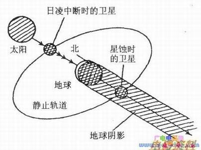 在星蚀期间,卫星上的太阳能电池不能正常工作,整个卫星所需的能源由星载来供给。为了减轻蓄电池的负荷,可以通过卫星在轨道上定点位置的设计,使星蚀发生在服务区的通信业务量最低的时间里。