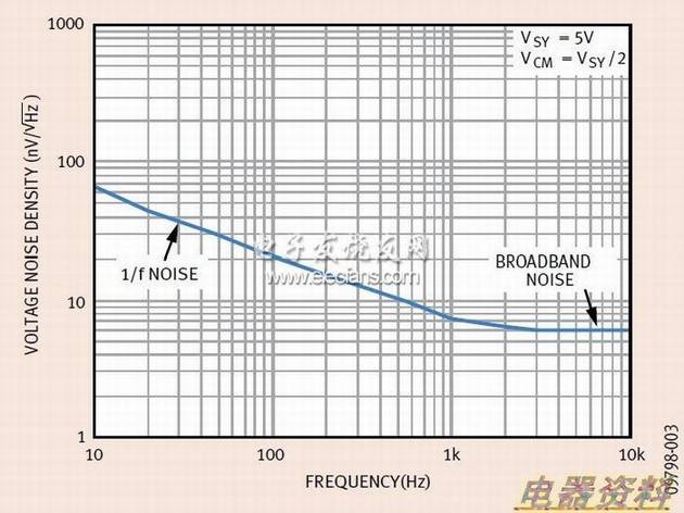 图2:非零漂移放大器:电压噪声密度与频率的关系