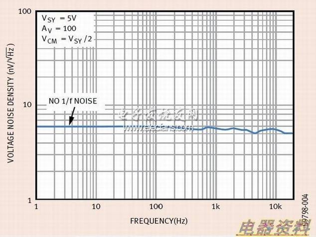 图3:零漂移放大器:电压噪声密度与频率的关系