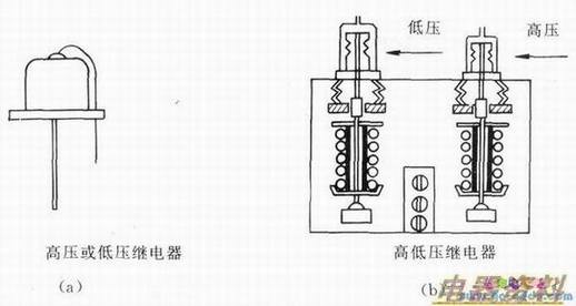压力是在制冷系统过压或欠压时,保护压缩机不被损坏。按功能可分为高压或低压继电器,它们分别用于控制冷凝和蒸发压力。当制冷系统高压超过额定值,低压低于额定值时,触点动作使压缩机停止工作。