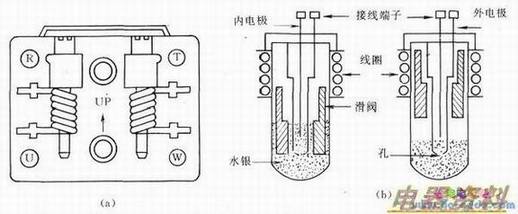 水银过流主要用于三相压缩机过保护中,其外形如下图(a)所示,内部结构如下图(b)所示。