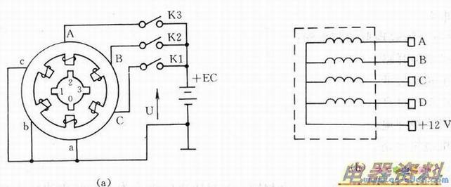 常作为电子膨胀阀或分体空调器室内导风电机。步进电机结构如下图所示,这是一种三相反应式步进电机,定子中每相的一对磁极只有2个齿,三对磁极有6个齿。转子中有4个齿分别为0、l、2、3,当直流+U通过开关K分别对步进电机的A、B、C相绕组轮流通电时,就会使电机作步进转动。