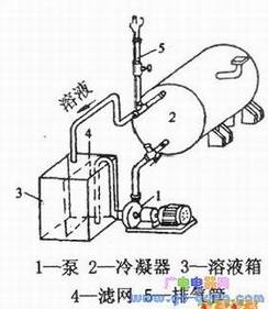 c.将冷凝器的进、出入管接头,用同直径的水管接于酸洗系统中(见下图)。盐酸水(酸洗液的配制;盐酸水浓度为10%,每1kg盐酸水溶液中加入0.5g缓蚀剂,即六次甲基四胺或苯胺与六次甲基四胺的混合物)从冷却水出口流入循环槽,经槽中过滤网过滤后,重复循环使用。循环时间视水垢清除程度而定。