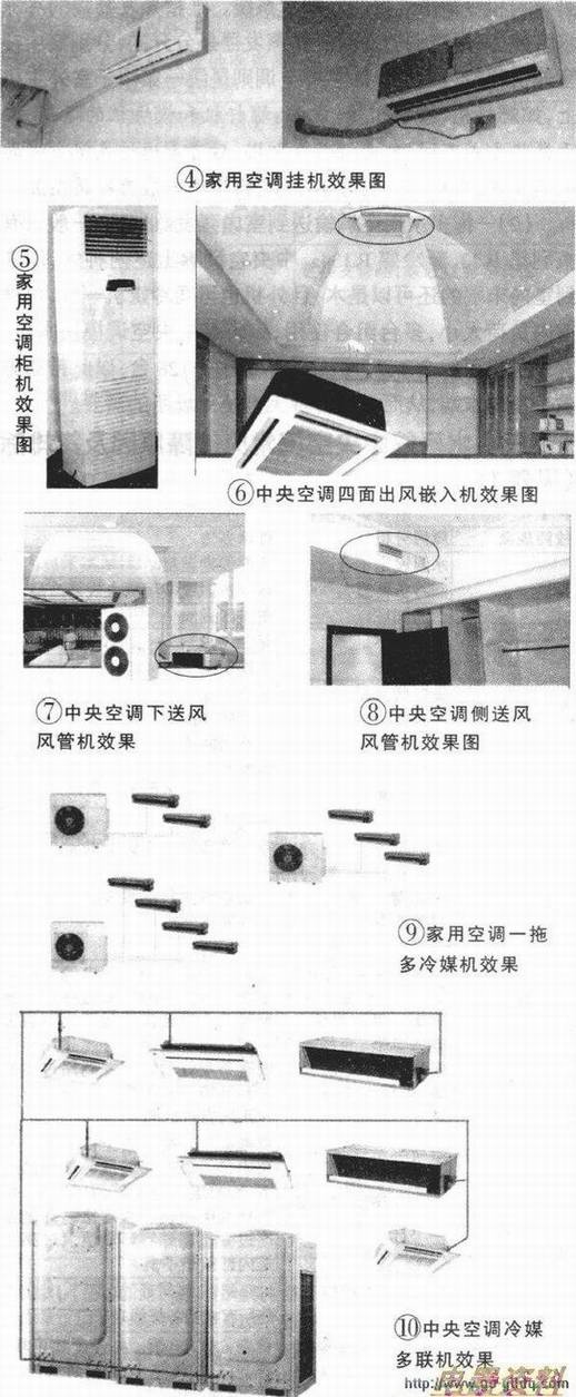 (分冷媒机和水机)家用空调和中央空调冷媒机的室内机及安装方式不同,家用空调一般只有挂机(内机为壁挂式,见图4)和柜机(内机为立地式,见图5),是明装挂于墙体上或者立于地上的;中央空调除柜式机外,还有四面送风的嵌入机,见图6,下送风、侧送风出的风管机,见图7、图8等,一般都暗装于室内吊顶内,不占用室内地面空间。
