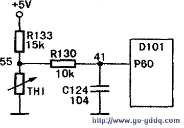 控制原理:附图是室外温控控制原理图。感温探头TH1是一个负的热敏,即温度越高越小,温度越低越大。热敏电阻将感知温度变化转化为电阻的大小变化,再经分压电路进一步转化为变化的,送入。单片机将接收到的电压值通过内部程序进行运算比较,以决定是否进行除霜。