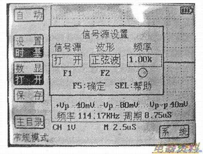 打开ET521A示波表开关,将控能开关放在OSC档,然后按下开关2s左右,松开按健,屏幕弹出一个窗口,如上图所示。按“Fl”键打开信号源,按“F2”键选择正弦波,再旋转编码开关选择1k,选择好后,按“F5”键确认。弹出的窗口退出,在波形显示区的左上角,有一符号显示出正弦波1kHz,如下图所示。