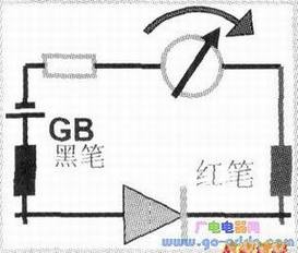 (1)指针式置欧姆档时,可等效为上图,黑表笔接表内正极,对外显正性,红表笔接表内负极,对外显负性。若按中图,黑表笔接阳极,红表笔接二极管阴极,二极管则正偏导通,万用表指针右偏较大角度,并指示较小的正向导通值,具体情况见实测见下图。
