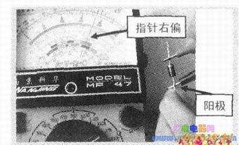 若按下图,黑表笔接二极管阴极,红表笔接二极管阳极,二极管反偏截止,万用表指针右偏的角度几乎为零,并指示极大的反偏截止,具体情况见实测见图7,所以综上可得出指针式万用表测量判断正常二极管极性原则是:将红黑两表笔分别接二极管两管脚先测一次,对调红黑两表笔后再测一次,两次检测中万用表指针右偏较大角度时黑表笔所接二极管管脚为阳极,则另一管脚为阴极。