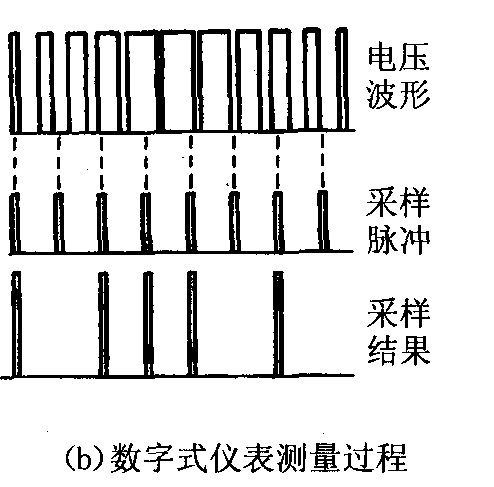数字式仪表中并无线圈,其主要测量方法是:利用一系列固定的采样脉冲对被测量进行“采样”,如下图(b)所示。每隔一段时间(如50的一个或半个周期)计算一次采样结果的,得到与被测量成比例的数值,作为其测量结果。