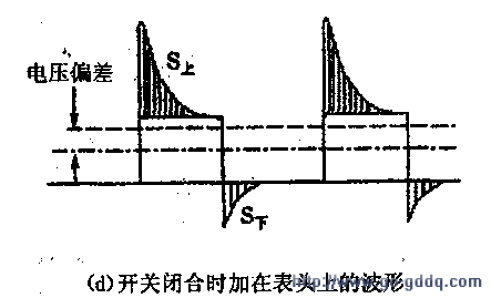 测量脉冲电压平均值有误差的万用表,在直流电压档使用时,为交流电压档整流设计的Dl、D2始终是接入电路的(即开关K是闭合的),而无误差的万用表(如MF47型等)中在直流电压测量时这条支路是断开的(即开关K断开)。这两种接法,虽然对直流测量没有什么不同,但对脉冲平均电压的测量却有不同的效果。由于脉冲电压有丰富的谐波,而电路中不可避免地有分布的存在,这些分布与电阻网络构成的阻容网络对脉冲电压的响应,使加在表头上的信号变成如下图(b)所示的波形,如果D1、D2支路是断开的话,阻容网络在表头两端电压波形上、下阴影部分的面积是相等的,其直流平均值由于上、下阴影面积一正一负而抵消,实际测量的平均值不受分布电容的影响。若D1、D2支路始终是接入的话,由于二极管对负向脉冲的限幅作用,使负向脉冲的面积小于正向脉冲的面积,如下图(c)所示,结果平均值偏大,而且,脉冲的高度愈高,偏差愈大。