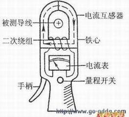 用来测量交流的钳形电流表主要由电流器、、磁电系电流表、量程转换开关及测量组成,如上图所示。其互感器的铁心有一活动部分在钳形表的上端,并与手柄相连,使用时按动手柄使活动铁心张开,将被测电流的导线放入钳口中,然后松开手柄使铁心闭合。