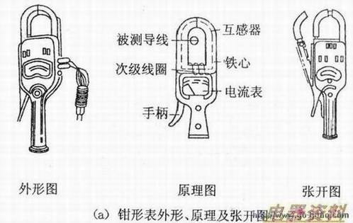 钳形电流表的主要部件是一个穿心式电流器,在测量时将钳形电流表的磁铁套在被测导线上,形成1匝的初级线圈,利用电磁感应原理,次级线圈中便会产生感应电流,与次级线圈相连的电流表指针便会发生偏转,指示出线路中电流的数值。