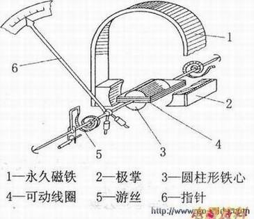 在仪表的固定部分中,永久磁铁“1”的两极固定着极掌“2”,两极掌之间是圆柱形铁心“3”。